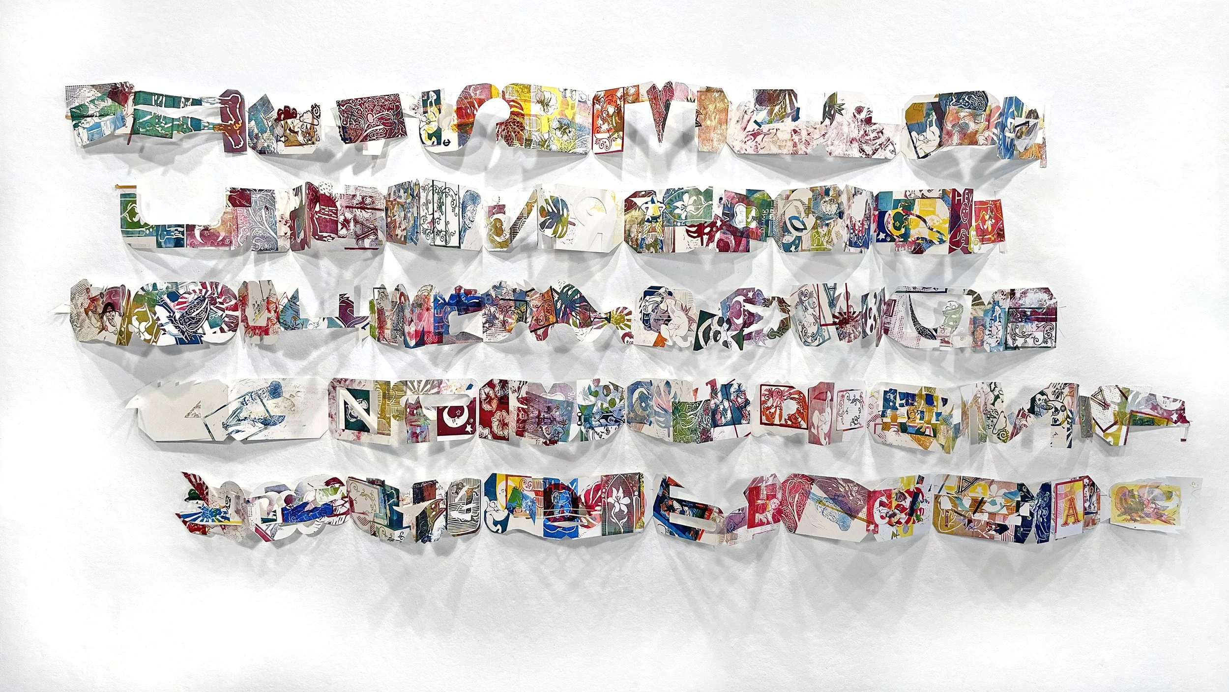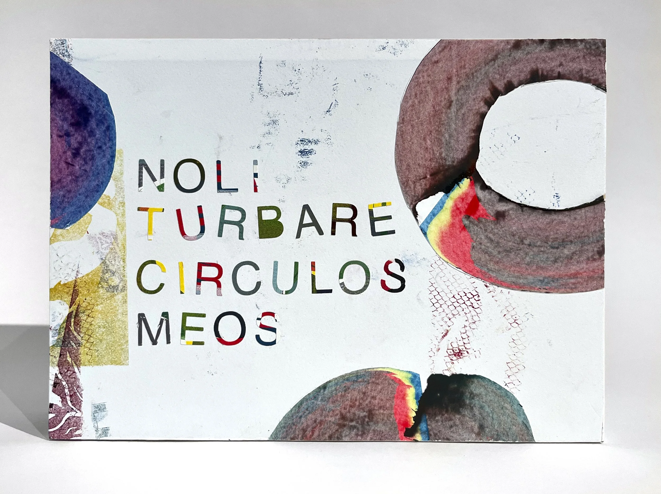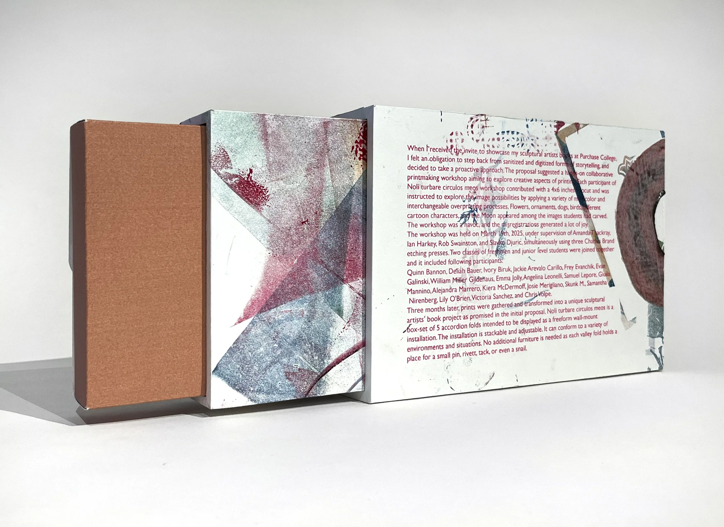 When I received the invite to showcase my sculptural artists books at Purchase College, I felt an obligation to step back from sanitized and digitized forms of storytelling, and decided to take a proactive approach. The proposal suggested a hands-on collaborative printmaking workshop aiming to explore creative aspects of printing. Each participant of Noli turbare circulos meos workshop contributed with a 4x6 inches linocut and was instructed to explore the image possibilities by applying a variety of multicolor and interchangeable overprinting processes. The workshop was a havoc, and the misregistrations generated a lot of joy. The event took place on March 19th, 2025, under supervision of Amanda Thackray, Ian Harkey, and Rob Swainston, simultaneously using three Charles Brand etching presses, and it included following participants: Quinn Bannon, Deliah Bauer, Ivory Biruk, Jackie Arevalo Carillo, Frey Evanchik, Evan Galinski, William Miller Gildehaus, Emma Jolly, Angelina Leonelli, Samuel Lepore, Giulia Mannino, Alejandra Marrero, Kiera McDermoff, Josie Merigliano, Skunk M., Samantha Nirenberg, Lily O'Brien, Victoria Sanchez, and Chris Volpe. Three months later, prints were gathered and transformed into a unique sculptural artists’ book project as promised in the initial proposal. Noli turbare circulos meos is a box-set of 5 accordion folds intended to be displayed as a freeform wall-mount installation. The installation is stackable and adjustable. It can conform to a variety of environments and situations.